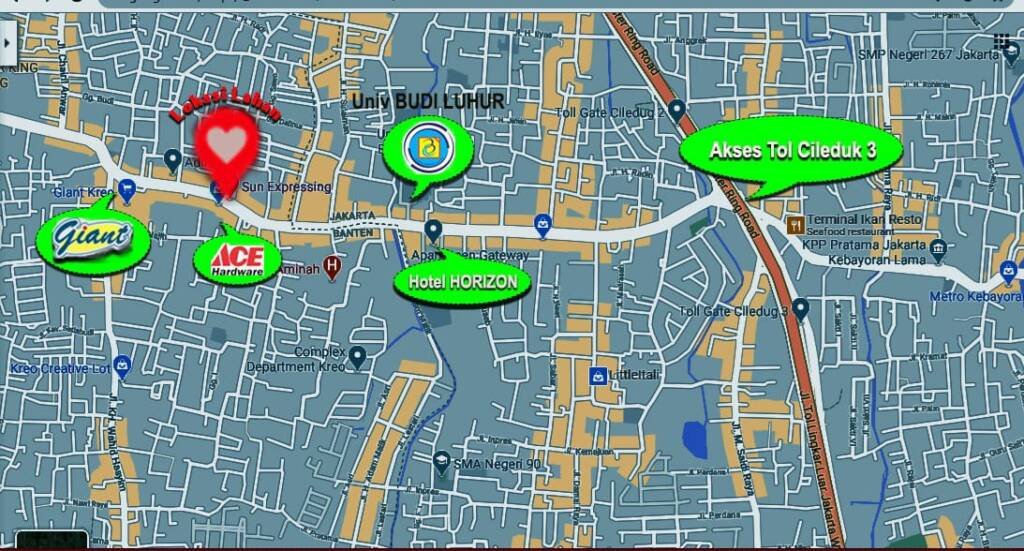 -Lokasi berada diseberang AC Hardware, Giant dan Hotel Horizon. Serta berada disederetan Univ Budi Luhur.
