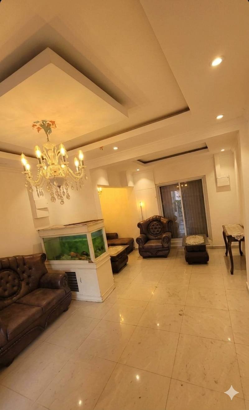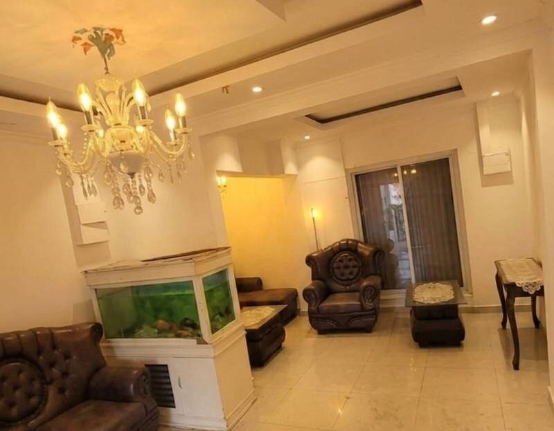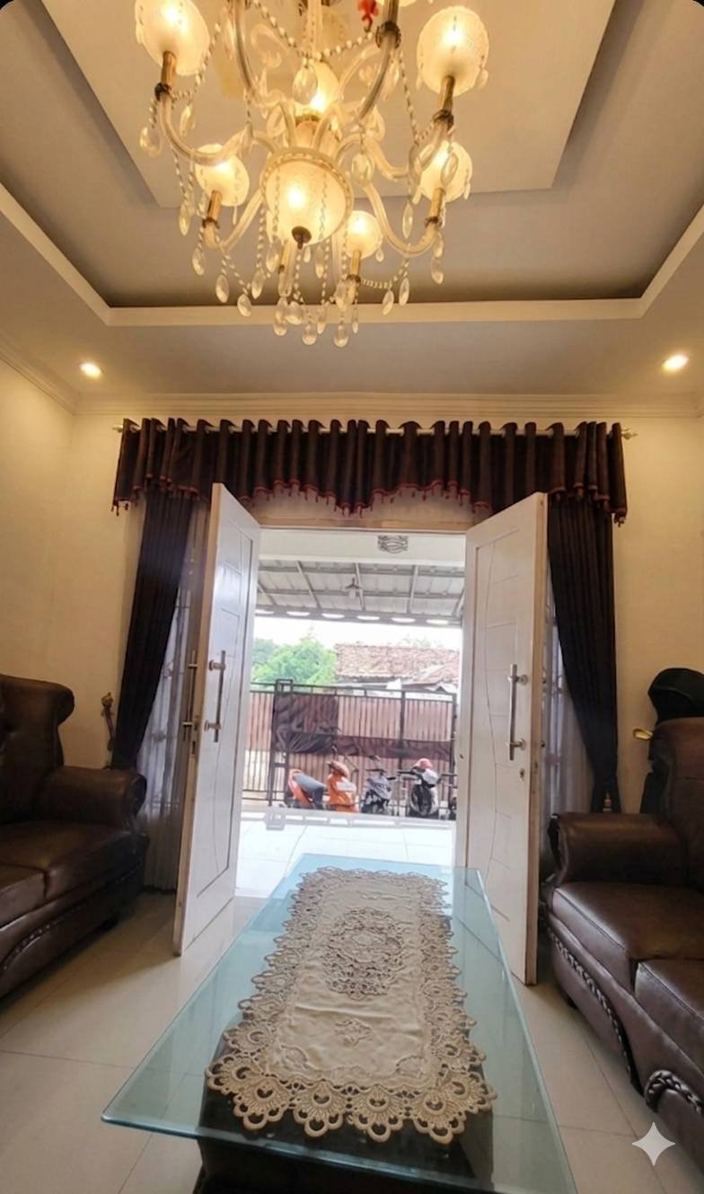 Ruang tamu dengan plafon drop ceiling & lampu kristal