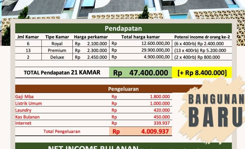 PLUS Potensi Additional Income Rp 8.4 Juta/ bulan jika kmr dihuni berdua (21 x 400rb)