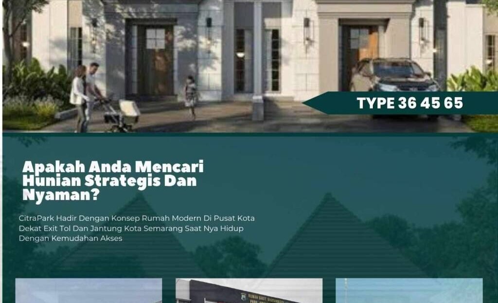 Perumahan pusat kota Tlogomulyo, Pedurungan, Semarang. CITRAPARK RESIDENCE. Tersedia berbagai tipe mulai 36, 45, 65 m2. Luas tanah mulai 72, 75, 80, 104 m2. Harga mulai 430jt. Bisa KPR, cash, dan softcash.